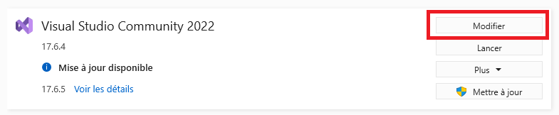 Si vous avez déjà installé Visual Studio sur votre ordinateur mais que ces modules ne sont pas installés, vous pouvez les installer en ouvrir Visual Studio Installer puis cliquer sur le bouton Modifier à côté de la version de Visual Studio que vous souhaitez utiliser.